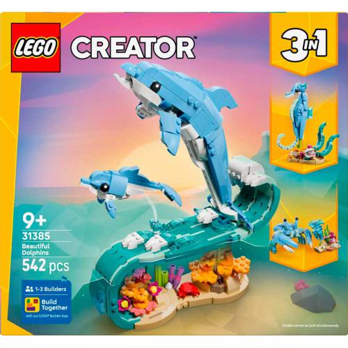 Desc. Técnica: O set LEGO Creator - Golfinhos, permite que as crianças criem histórias divertidas com animais marinhos, oferecendo três opções de construção com as mesmas peças, incluindo golfinhos em cenário de ondas, um cavalo marinho ou um caranguejo. Com elementos ajustáveis e suportes decorativos, este conjunto proporciona uma experiência criativa e envolvente. Depois de construídos, os modelos podem ser expostos como decoração em qualquer espaço.
