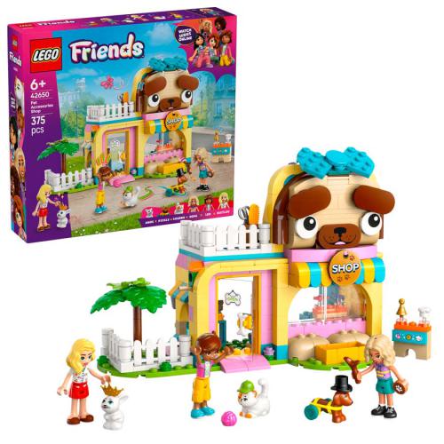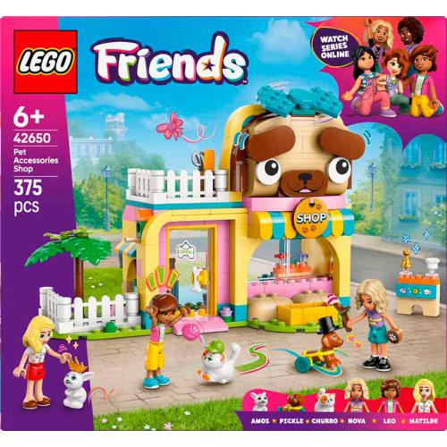 Desc. Técnica: O LEGO® Friends Loja de Acessórios para Animais permite às crianças criar histórias de cuidado com animais junto da Nova, Leo e Matilde. Inclui 3 minibonecos e figuras de gato, cão e coelho, além de acessórios como chapéus, caixa registadora e dinheiro. As crianças podem lavar, secar e cuidar dos animais numa estação com elevador. O set incentiva a imaginação, o jogo de faz de conta e o desenvolvimento de competências sociais.