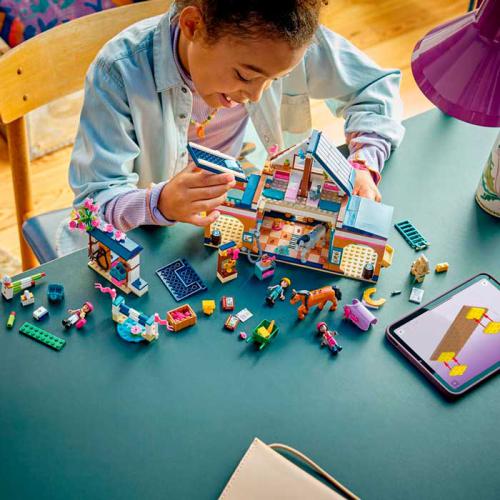 Desc. Técnica: O LEGO® Friends Estábulo e Academia de Equitação permite às crianças criar histórias com a Liann, a Aliya e a professora Cindy enquanto cuidam de cavalos. Inclui 2 cavalos, obstáculos para saltos, carrinho de feno e acessórios como sela, cenoura e troféus. As crianças podem alimentar, lavar e treinar os cavalos, além de usar as camas nos estábulos. Estimula a imaginação, o cuidado com animais e o jogo de faz de conta.