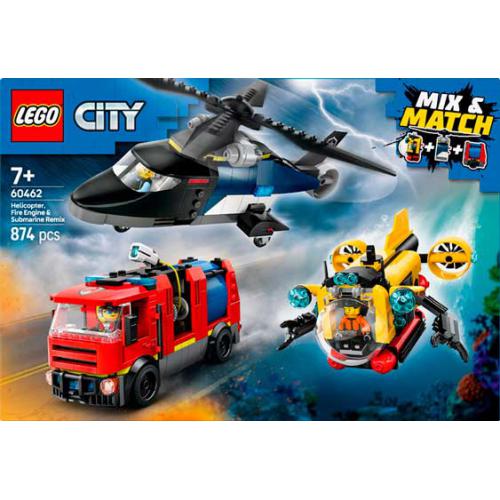 Desc. Técnica: O set LEGO® City Helicóptero, Camião dos Bombeiros e Submarino inclui 3 veículos modulares que podem ser combinados entre si para criar novas máquinas. Traz minifiguras de polícia, marinheiro e bombeiro, permitindo missões criativas de resgate e exploração com diferentes cenários.