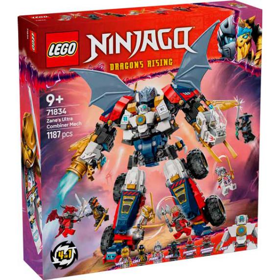 Desc. Técnica: Crianças podem recriar a ação de NINJAGO® A Ascensão dos Dragões com o Robô Ultra Combinador do Zane, que se transforma em quatro modelos, incluindo dragão, jato e carro. O robô tem membros e cabeça ajustáveis, asas de dragão, cockpit e disparadores, oferecendo brincadeira muito variada. Inclui seis minifiguras com acessórios ninja para batalhas emocionantes. Cada modelo tem funções interativas que estimulam a criatividade. É ideal para horas de diversão no universo NINJAGO®.