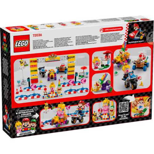 Desc. Técnica: Aos seus lugares, preparar, partida! Deixa que as crianças criem a sua própria pista e veículos Mario Kart™ com o set LEGO® Super Mario™: Mario Kart: Conjunto Bebé Peach e Grande Prémio. Inclui os veículos Lagartóvel, Autonavio e Mota Padrão, além de linha de partida, barreiras, cones, pódio, carrinho de doces do Toad e a nuvem do Lakitu. O set vem com as figuras de Peach Bebé, Lakitu, Lemmy e Toad. Coloca o Mario™, Luigi™ ou a Peach™ (vendidos separadamente) para efeitos interativos nas corridas.