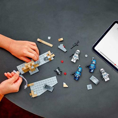 Desc. Técnica: Deixa as crianças recriarem batalhas com jetpacks em Mandalore com este pack de combate LEGO® Star Wars inspirado em The Mandalorian. Inclui várias minifiguras Mandalorianas e Imperiais, com acessórios como blasters, detonadores e jetpacks para ação cheia de movimento. Tens também uma formação rochosa com caverna e um canhão para intensificar os confrontos e dar mais possibilidades de brincadeira. O elemento transparente permite simular voos épicos durante as batalhas.