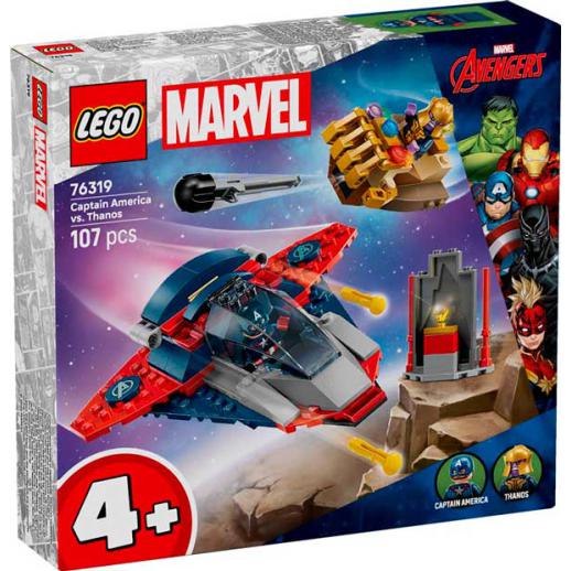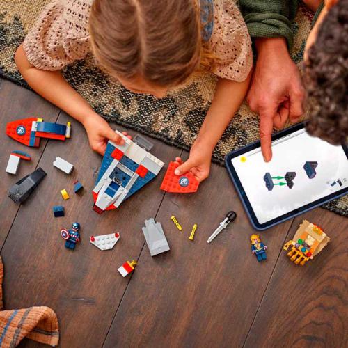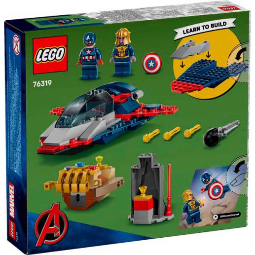 Desc. Técnica: O set para construir e brincar inclui 2 minifiguras: Thanos numa nave criada à semelhança da Manopla do Infinito, com «dedos» móveis e lançador de mísseis, e o Capitão América com o elegante Quinjet com 2 disparadores, cockpit que abre e compartimento para esconder o seu escudo. O modelo em separado oferece uma pedra cósmica para inspirar brincadeiras criativas enquanto o Capitão América tenta impedir que Thanos a roube.