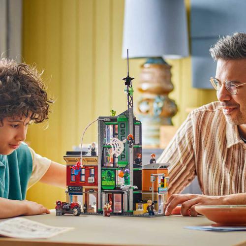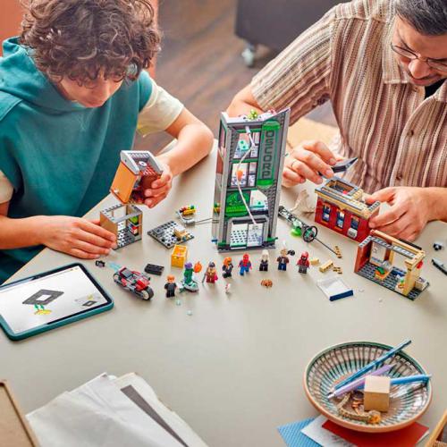 Desc. Técnica: A rua inclui 3 edifícios diferentes: apartamento do Miles Morales com loja de joias por baixo, o edifício Oscorp e o apartamento do Venom com a loja em baixo. Cada divisão tem equipamentos e acessórios relevantes. As 8 minifiguras LEGO dos filmes da Marvel garantem ação entre teias sem fim: Spider-Man, Spider-Woman, Miles Morales com mota, Eddie Brock, Ghost-Spider, Norman Osborn, Kraven - O Caçador e o Green Goblin com planador. As hastes transparentes permitem que as crianças ajustem facilmente as personagens.
