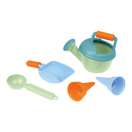 Desc. Técnica: Regador LENA® com acessórios, conjunto de 5 peças. Regador com pega antiderrapante, capacidade de 0,5 l, colher de gelado e 2 cones de gelado. Cores sortidas. Adequado para crianças a partir dos 12 meses. Embalado em rede, com etiqueta suspensa com informações sobre o produto. FABRICADO NA EUROPA. Certificado TÜV ID 38607