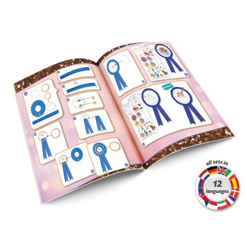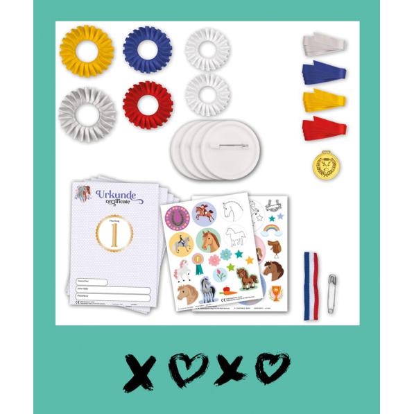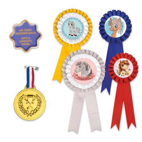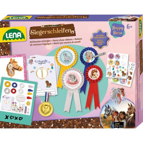 Desc. Técnica: LENA® Fitas de vencedor Hobby Horsing. Conjunto completo que inclui rosetas, fitas decorativas, suportes, bases de feltro com purpurina dourada, elementos em espuma EVA, modelos de diplomas, autocolantes e fitas. Com instruções detalhadas e a cores. Para crianças a partir dos 6 anos. Embalado numa caixa de cartão colorida com informações sobre o produto.