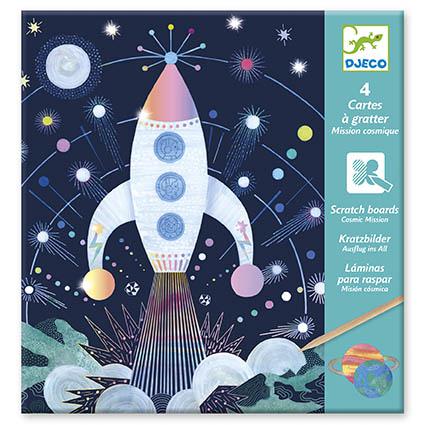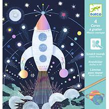 Desc. Técnica: Uma embalagem com 4 raspadinhas iridescentes para uma missão cósmica, cheio de surpresas. As crianças podem reproduzir os motivos imaginados pelo artista, riscando a superfície com o estilete de madeira. Pouco a pouco, as ilustrações revelam-se como que por magia!