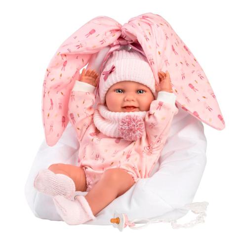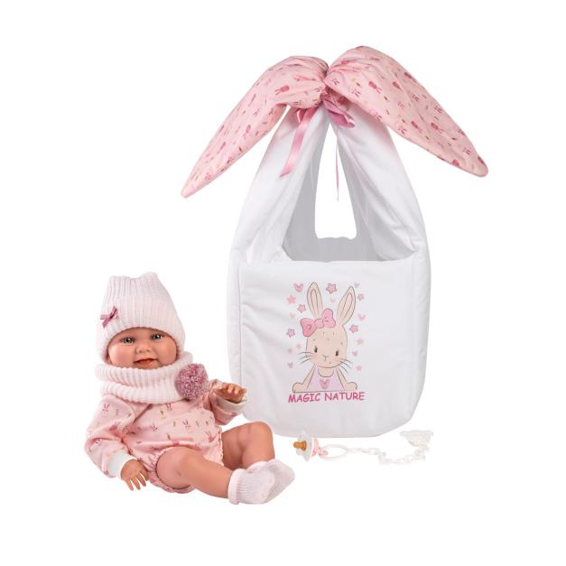 Brinca com a Nica durante horas e aprende a cuidar de um recém nascido! Ela tem um pijama rosa de manga comprida, com coelhinhos estampados e meias brancas. Tem um gorro e uma gola de malha cor de rosa. Podes levá-la a passear no seu porta bebés. A Nica tem roupinha 100% algodão, que deves lavar com água fria. Braços e pernas articulados. Tem a pele muito suave e corpo de vinil. Inclui chupeta. Feito à mão em Espanha.