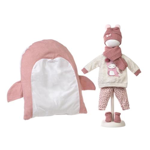 Desc. Técnica: Camisola com pinguim, calças, gorro com pompons, cachecol e meias em tons de rosa. Manta pinguim em branco e rosa.