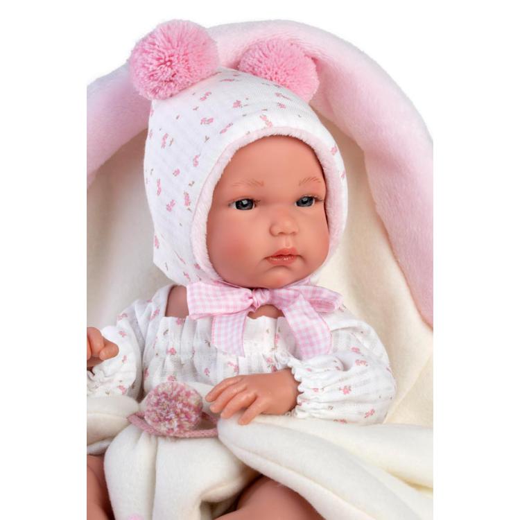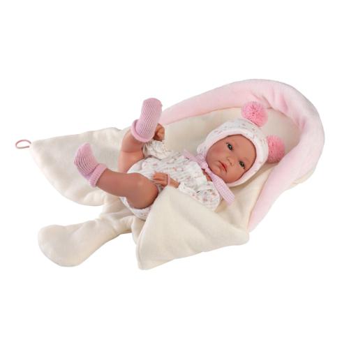 Tina é a tua nova companheira de brincadeiras. Ela é muito pequenina e precisa de toda a tua atenção, carinho e cuidado. Veste um amoroso babygrow de manga comprida com flores, e uma touca com um laço grande rosa que ata ao pescoço e dois pompons rosa. Este saco de dormir é um 2 em 1, o que significa que funciona como saco-cama e também como trocador de fraldas. Corpo em vinil, braços e pernas articulados.
