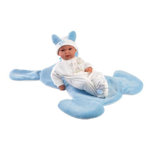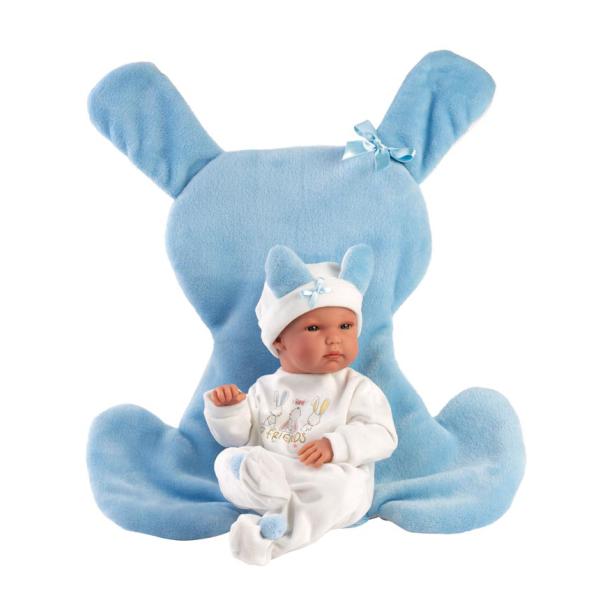 Agora podes tomar conta do Bimbo, que é um bebé muito querido e simpático. É recém-nascido e vai precisar de muita atenção e carinho. Para que não tenha frio e se sinta confortável, ele usa um babygrow com pés, com um gorro branco e azul com orelhinhas e um laço! Podes deitá-lo ou sentá-lo na sua almofada fofinha em formato de coelho, para que durma uma soneca ou fique a brincar.