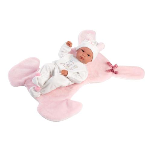 Agora podes tomar conta da Bimba, que é uma bebé muito querida e simpática. É recém-nascida e vai precisar de muita atenção e carinho. Para que não tenha frio e se sinta confortável, ela usa um babygrow com pés com dois pompons, e um gorro branco e rosa com orelhinhas e um laço! Podes deitá-la ou sentá-la na sua almofada fofinha em formato de coelho, para que durma uma soneca ou fique a brincar.