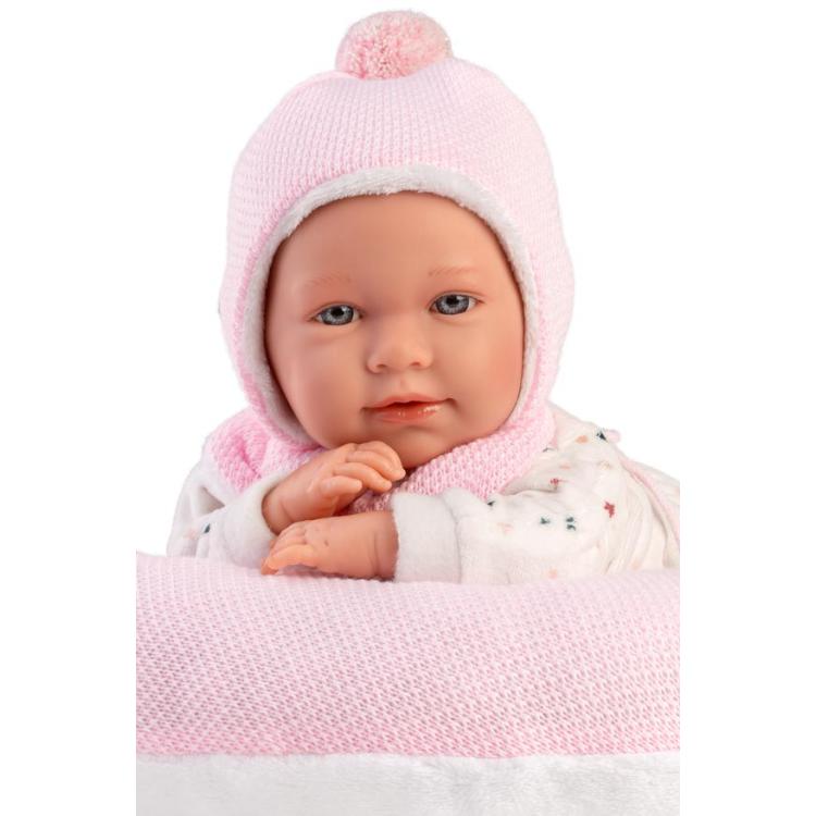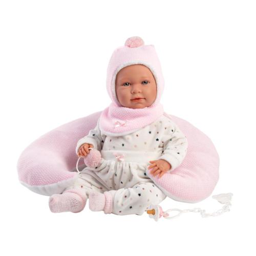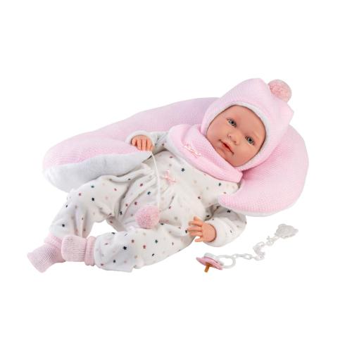 Desc. Técnica: Boneca com 42 cm, de corpo mole, em tecido. A cabeça, braços e pernas são de vinil. Chora e diz "Mamã" e "Papá". Chupeta e almofada incluídas. Pilha: RL- 44. Roupa 100% Algodão - lavar com água fria. Feito à mão em Espanha.