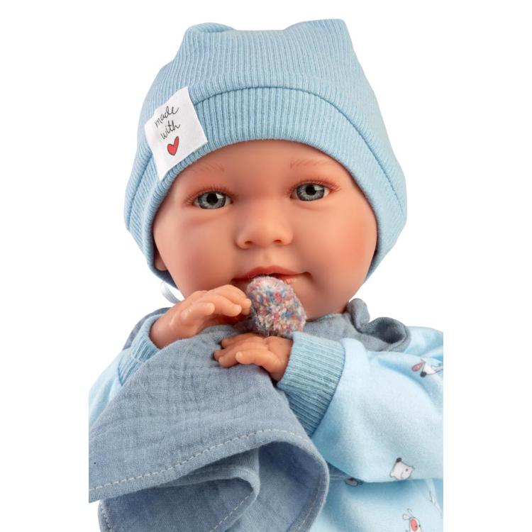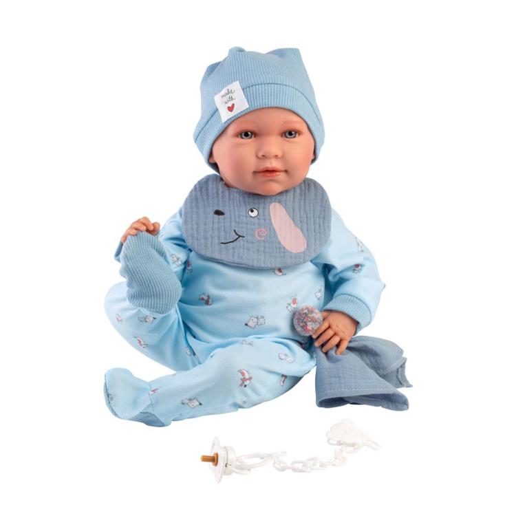 Desc. Técnica: Boneca com 42 cm, de corpo mole, em tecido. A cabeça, braços e pernas são de vinil. Chora e diz "Mamã" e "Papá". Chupeta, babete e doudou incluídos. Pilha: RL- 44. Roupa 100% Algodão - lavar com água fria. Feito à mão em Espanha.