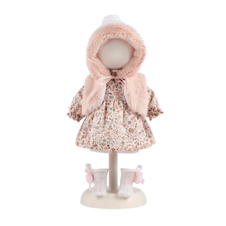 Vestido de manga comprida bege com flores e calções. Colete de pelo cor de rosa com capuz e pompom e meias brancas com pompons e laços.