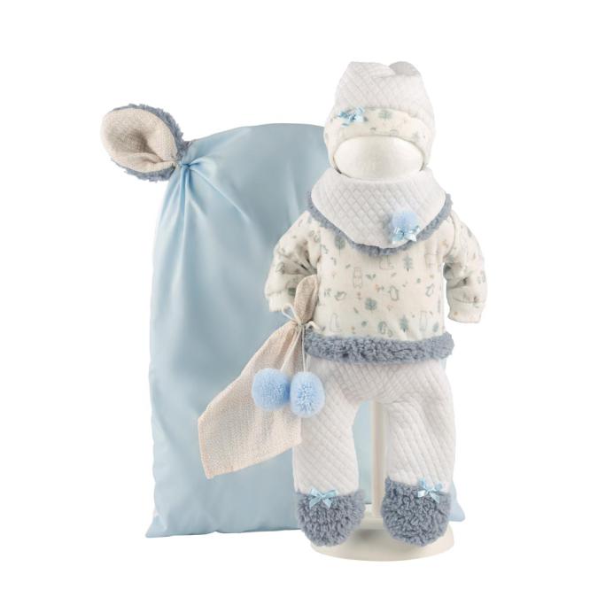 Camisola branca e azul, estampada. Calças são brancas, um babete e um gorro, com um lacinho. As roupas têm pormenores azuis em pelo. A almofada, azul e branca, tem duas "orelhinhas".