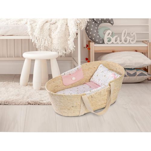 A cesta perfeita para os teus bebés dormirem! Lençóis brancos com bolinhas e girafas, com pormenores em cor de rosa. Deita-os nesta cesta e deixa-os sonhar enquando dormem confortáveis e quentinhos.