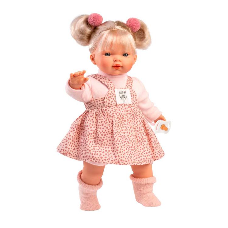 Desc. Técnica: Boneca de corpo macio, com 33 cm. A cabeça, braços e pernas são de vinil, agradável ao toque. Quando perde a chupeta, chora e diz mamã e papá. Pilha: RL - 44. Roupa 100% Algodão - lavar com água fria. Feita à mão em Espanha.