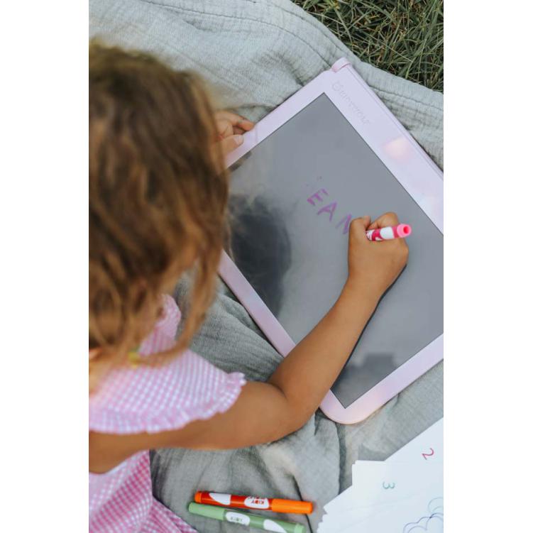 Portátil; Alimentado por uma bateria recarregável; Tela LED branca suave; 3 intensidades de luz; Conjunto de 4 marcadores neon (para o quadro negro); Kit de aprendizagem para escrever, contar e desenhar; Conector de carregamento universal (USB-C); Tampa magnética, equipada com almofadas de borracha; Compartimento de armazenamento